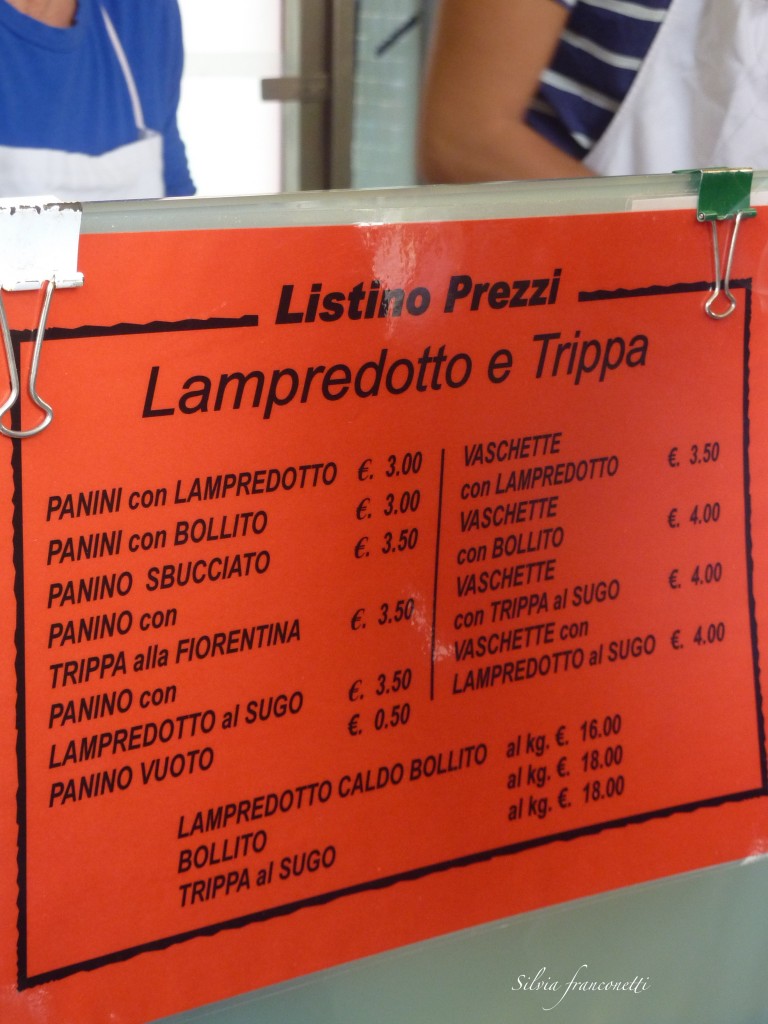 El Lampredotto es un un bocadillo típico de la ciudad a base de intestinos de cerdo estómago, para ser mas concretos, del cuarto estómago de la vaca (gracias Pedro) que nosotros lo conoceríamos como callos, cocinados lentamente con especias. Se corta en trozos y se introduce en una bollo de pan, salsa verde y salsa picante.