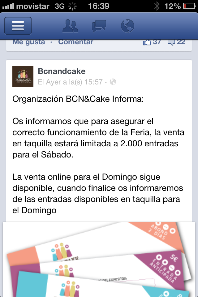 Por la tarde, compruebo en la página de BCN & Cake en Facebook que se pondrían a la venta únicamente 2000 entradas más en taquilla. Un WhatsApp a mi amiga: “No te preocupes, podrás comprar la entrada en taquilla”. Ella me contestaba que, pasaría sobre las 11,30, después de recoger a su amiga en el aeropuerto.